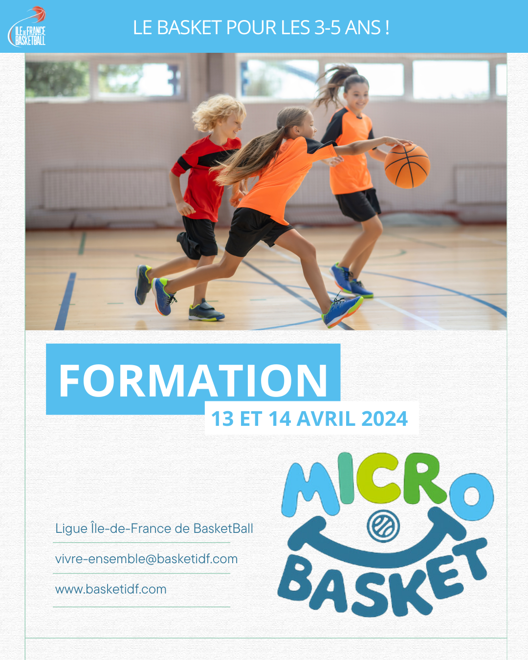 la formation « Animateur Micro Basket » comprenant l’accès au distanciel de la FFBB et le stage de formation en présentiel qui se déroulera le 13 et 14 Avril 2024.