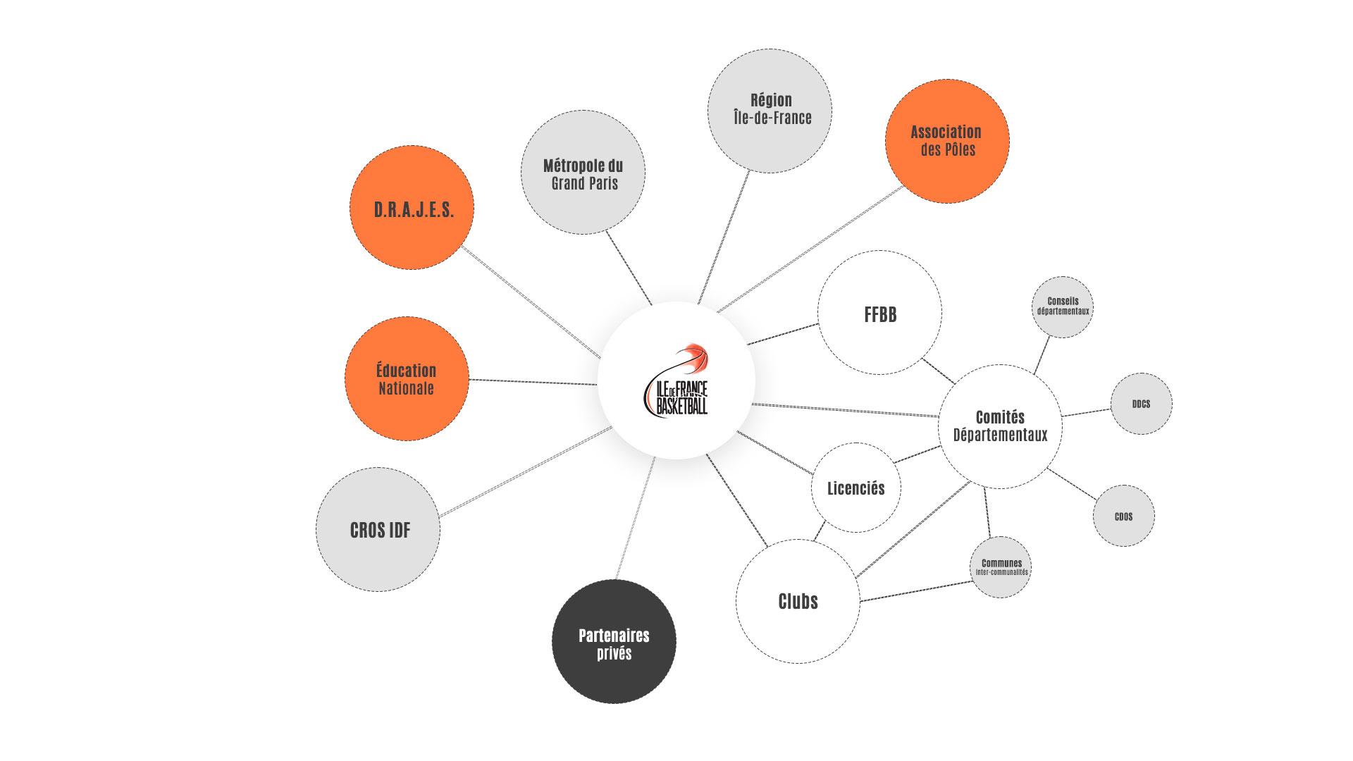 Instance déconcentrée de la Fédération Française de BasketBall sur le territoire francilien, la Ligue s’inscrit dans un environnement complexe d’acteurs , structuré autour de 4 types d’entités : les instances politiques régionales et locales, les structures du Ministère de l’Education Nationale, de la Jeunesse et des Sports, le réseau fédéral ainsi que les soutiens et partenaires privés.