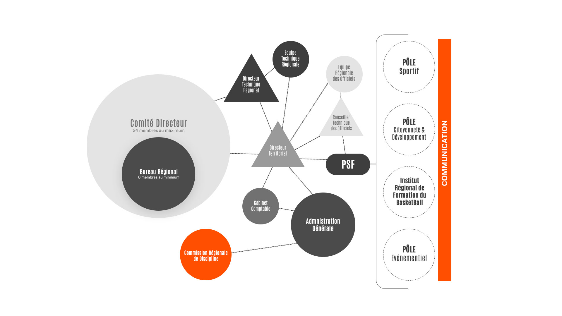 Administré par le Comité Directeur, le fonctionnement de la Ligue Ile de France de BasketBall s’organise entre plusieurs pôles de fonctionnement et commissions, composés d’élus, de bénévoles et de salariés, interagissant les uns avec les autres pour assurer le bon déroulement de l’activité de la structure.