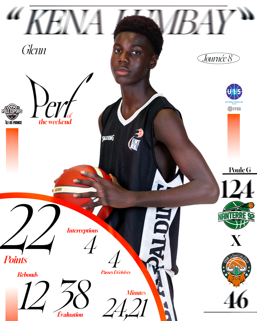 Avec une évaluation exceptionnelle de 38, Glenn a dominé la rencontre dans tous les compartiments du jeu. Sa présence offensive, son activité défensive et sa capacité à créer pour ses coéquipiers illustrent parfaitement son influence et sa maturité sur le terrain.