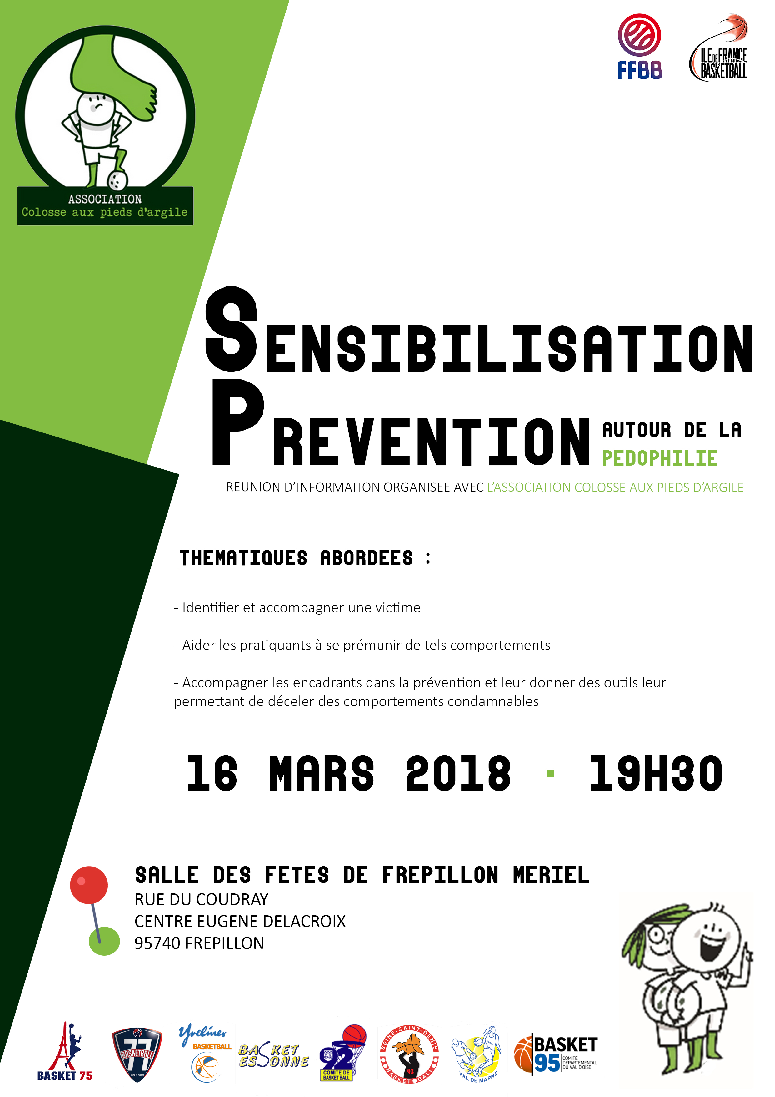 Organisée en collaboration avec l’Association Colosse aux pieds d’argile dans le cadre de leur partenariat avec la Fédération Française de Basketball, une réunion d’information aura lieu ce soir du côté de Frépillon (95740) à 19h30, sur la sensibilisation & la prévention liée à la pédophilie dans le sport.