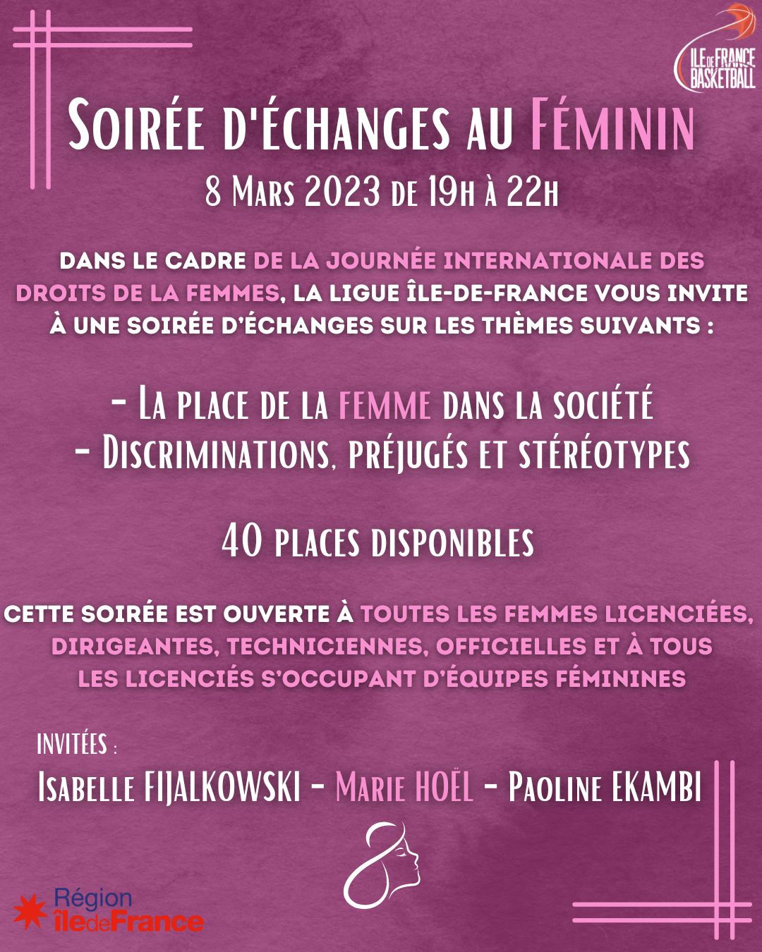 Dans le cadre de la journée internationale des droits de la femme, la Ligue Île-de-France a voulu créer une soirée d’échange sur des thèmes importants de notre époque. Les origines de la place de la femme dans notre société et plus particulièrement dans notre sport. Nous ouvrirons le débat ensuite sur les discriminations, les préjugés, les stéréotypes en les identifiant, en les comprenant et surtout en essayant de les appréhender le mieux possible avec la mise en évidence d’outils, de moyens pour les rendre moins prégnants.