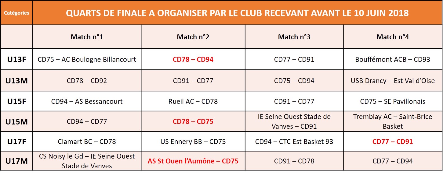 Les clubs recevants devront transmettre les dates choisies pour les quarts de finale à la Commission Sportive : sportive@basketidf.com. Les rencontres devront se jouer avant le 10 juin.